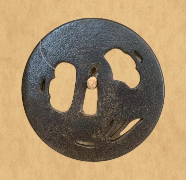 本格的な実用性と装飾性を追求した現代鐔匠 隆剣の作品「駒の図」です 今では鋳鉄を使った実用性を持たない鍔が多くなってしまいましたが、素材に鍛鉄を使い、一つ一つを鋼板から切り出し、独自の時代付け加工を施している物自体が、今では貴重な物となっています。このため、居合や抜刀術の為の刀にも、また美観を重視する装飾刀に設えられる数少ない日本刀鐔です。 また前述の通り日本刀に設えるために製作されていますが、単独でインテリアやアクセサリなどとしても使われている人も多くいらっしゃいます。 一点ものですので、是非、この機会にお買い上げください。 なお、設えなどにつきましては、お買い求めの際、あるいはお問い合わせ欄にご記入をいただければ対応いたします。 サイズ タテ 79mm ヨコ 79mm 厚さ 4mm